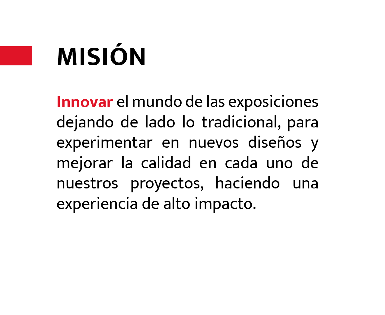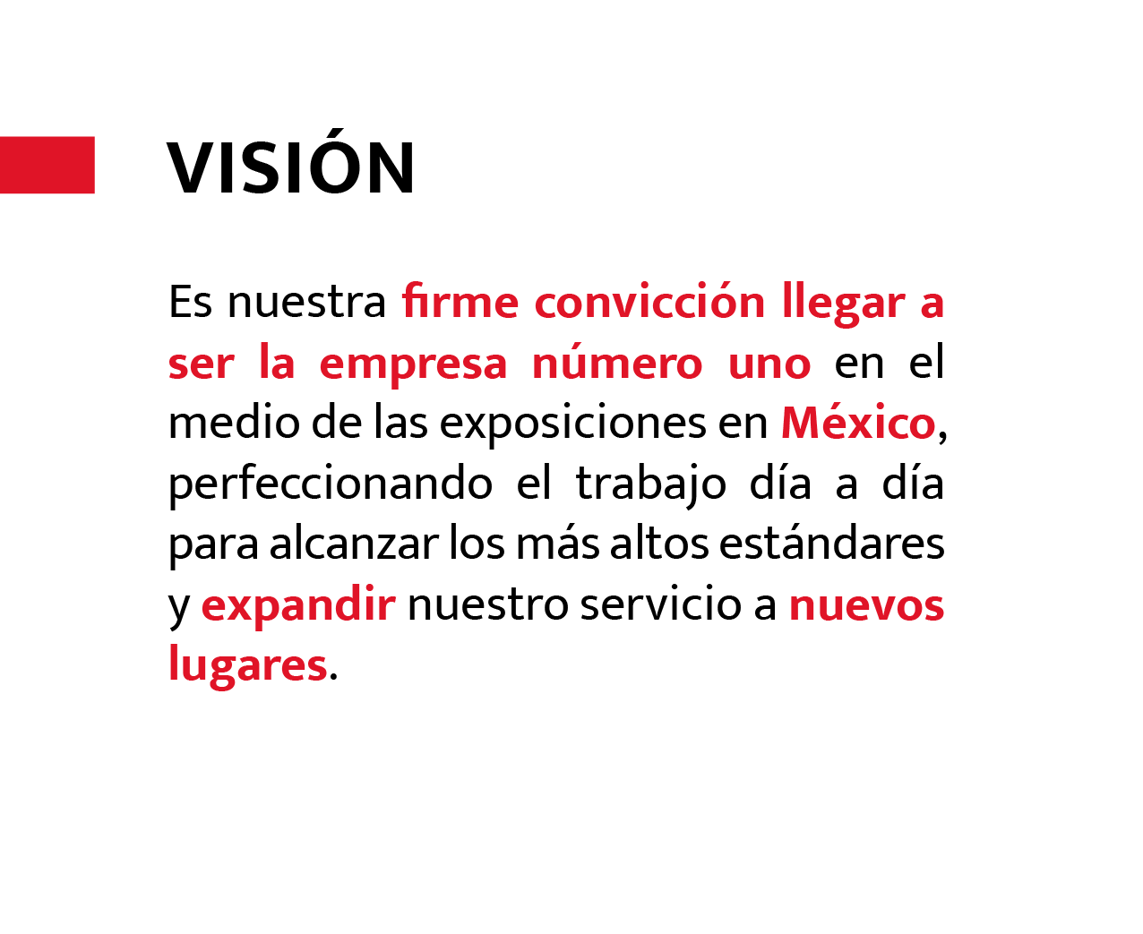 Somos una empresa 100% mexicana fundada por un equipo de jóvenes emprendedores con más de 20 años de experiencia en el medio y que ofrece innovar el mundo de las exposiciones, donde el factor tiempo es lo más importante, sin poner en riesgo la calidad en los acabados, que en conjunto con nuestro personal calificado y profesional, nuestro propio taller, garantizamos el cumplimiento de los servicios que ofrecemos marcando una gran diferencia con la competencia.
